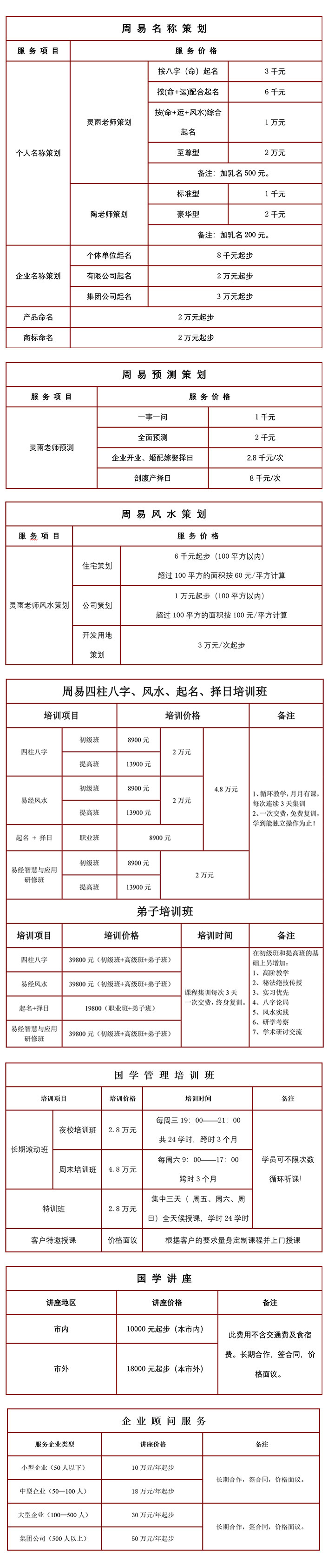 服 务 项 目 价 格 表