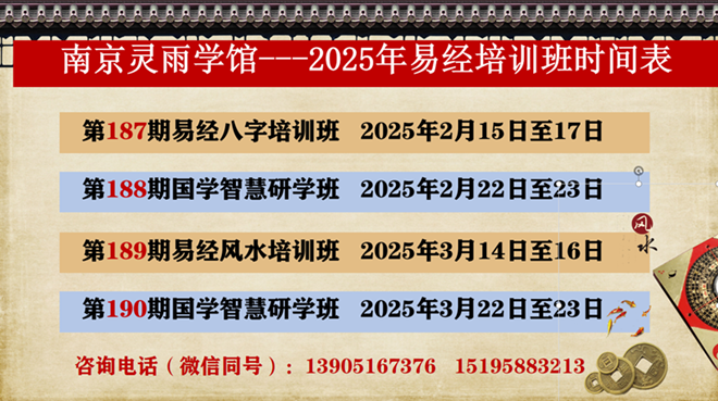 南京灵雨学馆,全国知名易经八字风水培训学院,江苏省首家易经培训中心,南京三十年老牌易经八字风水培训学院 ,专业从事易经八字风水培训20多年,不仅有着一流的教学环境,更有全国一流的易经专家全程授课,20多年来,我们始终坚持真传实教的办学理念,真正做到让每个学员都能乘兴而来,满载而归,南京灵雨学馆每月一期易经八字风水培训班,循环授课,免费复训,学会为止,欢迎大家咨询报名学习交流。